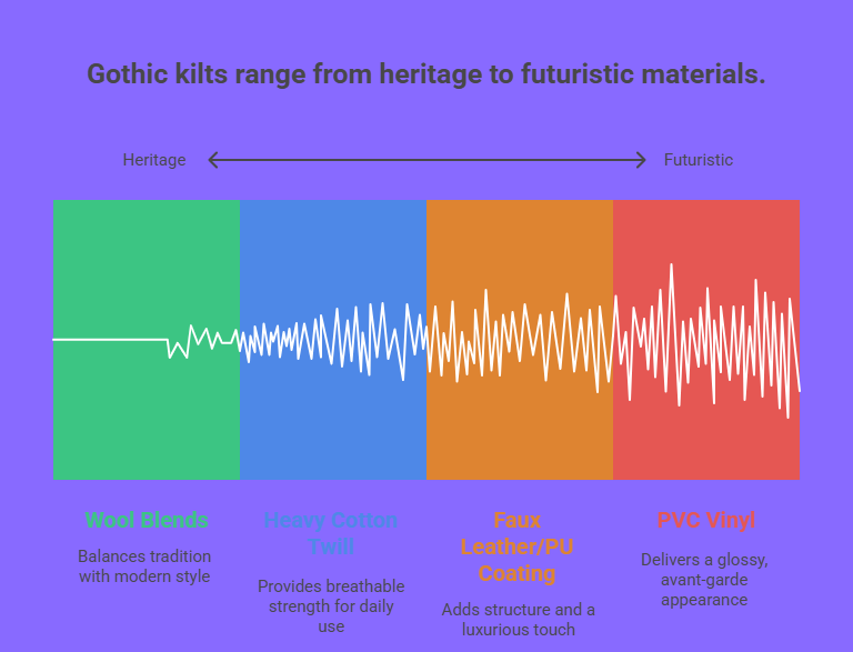 Unlike traditional kilts, which rely on wool and tartan, gothic kilts embrace an industrial, avant-garde palette: